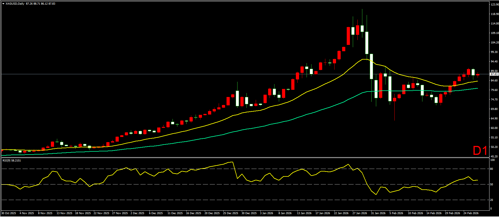 小时图上,昨日白银在开盘小幅反弹后再度转跌,最低跌至85.01附近才有所企稳,并逐渐回升,重新站上均线。短线形态上看,白银调整重心有所下移,但并未出现单边下行趋势,整体仍保持震荡走势,若日内黄金走势偏强,白银也同样有探顶的机会,因此在操作上建议,先保持高抛低吸震荡操作为主。