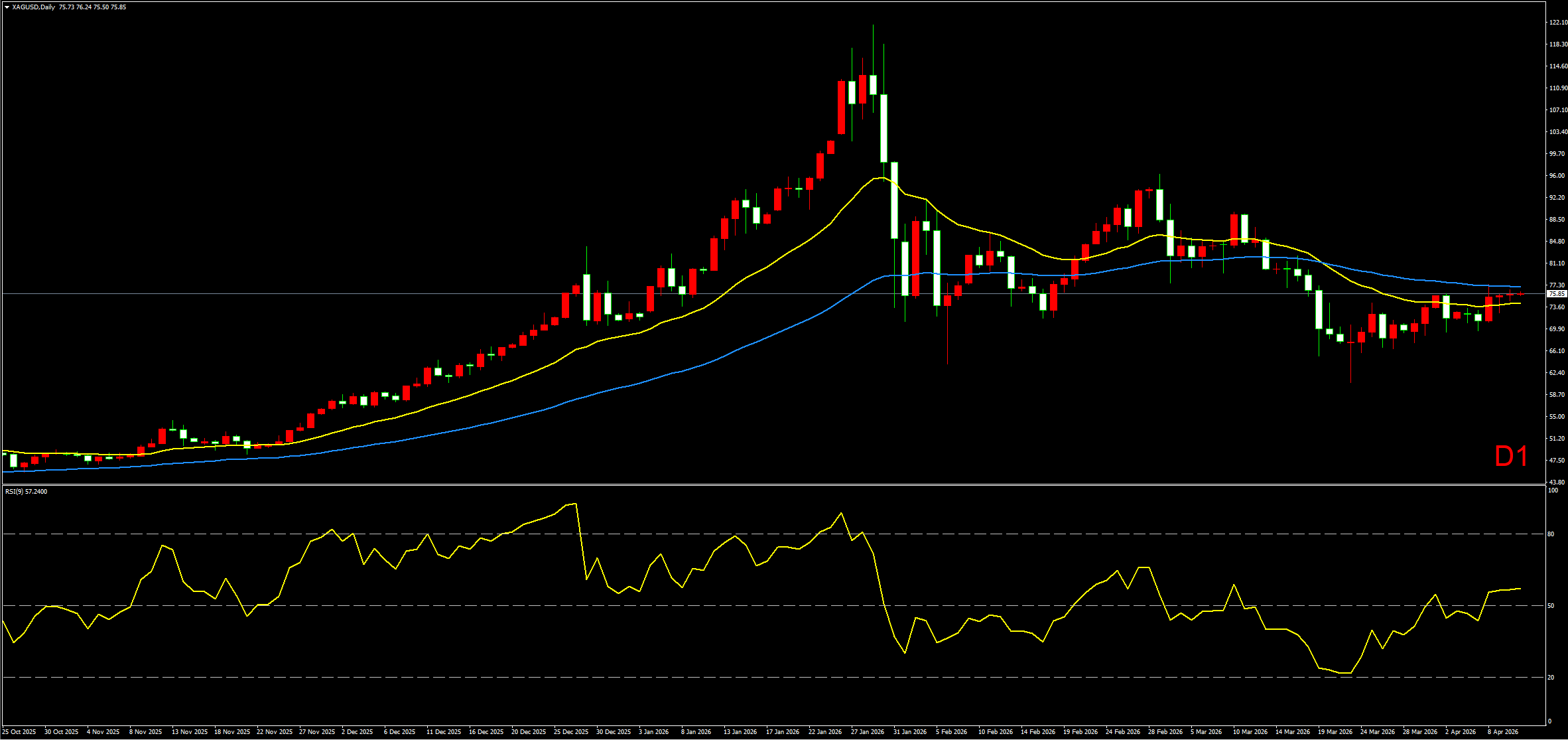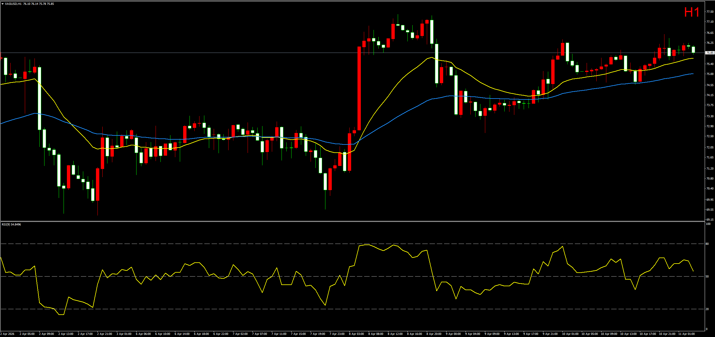 小时图上,上周五白银继续保持均线上方震荡收敛走势,日内波幅非常小。不过,美伊谈判失败后,白银空头力量加强,日内或将考验73.10附近的支撑,若失守73.10一线,则银价将逐步回踩70.00附近寻求支撑。因此在操作上建议,先以反弹高空为主。